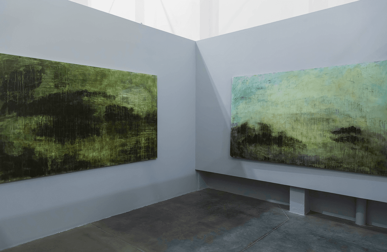 This new series of works, produced in 2024 specifically for this exhibition, is much more gestural than her previous output. The violent gesture of the “splash” of water is more visible and encompasses the entirety of the paintings. The directions of the dripping also reveal that the artist rotates the canvases to direct the water in all directions, turning the process into a performative gesture. Furthermore, the outline of the body is visible in strong lines that delimit the reach of her body in the canvas, making each painting a print not only of the movement of the water, but also of the movement of her own body.